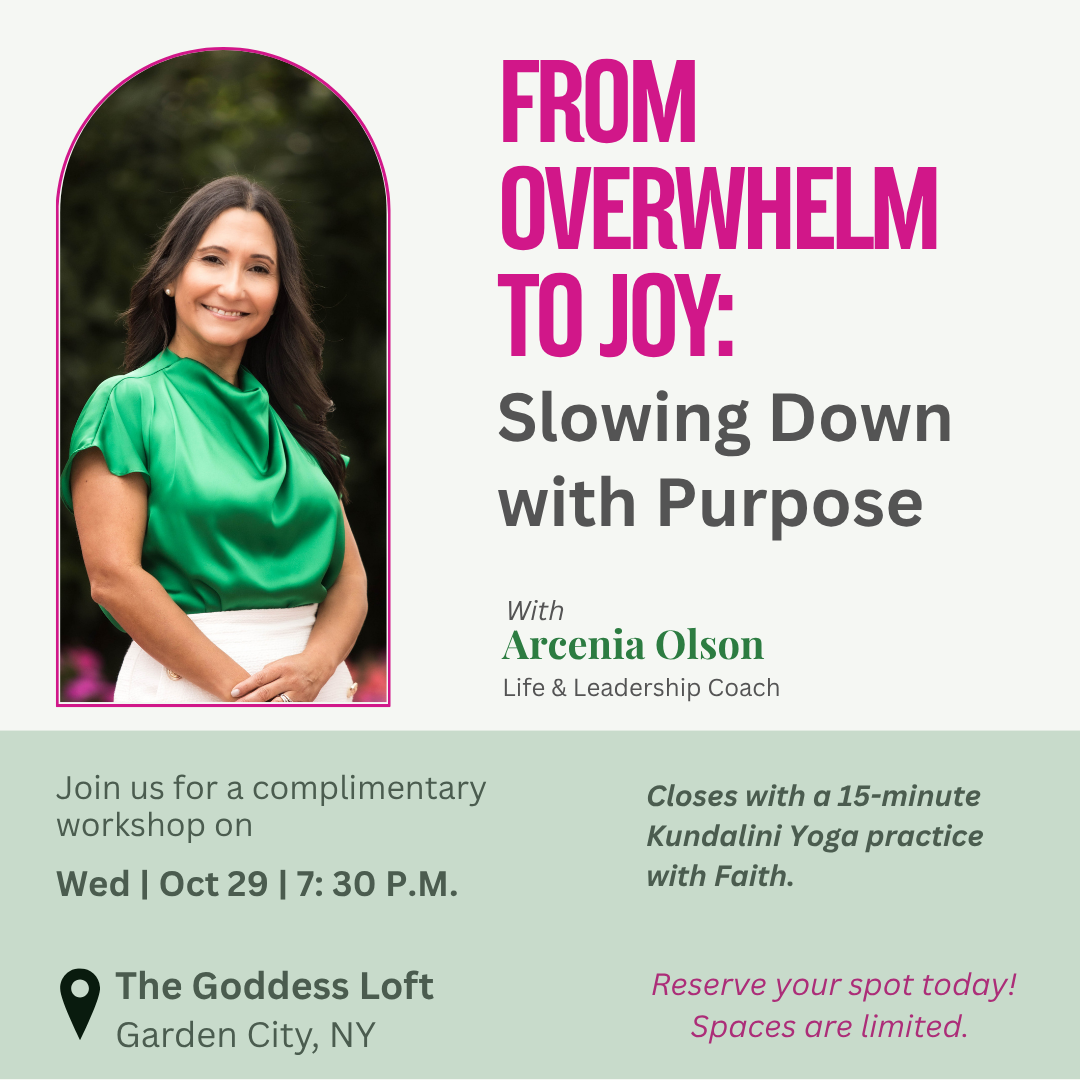 Led by ICF-certified Life & Leadership Coach Arcenia Olson, this interactive session combines practical tools with reflective exercises designed to help you shift from overwhelm to calm, clarity, and joy.